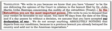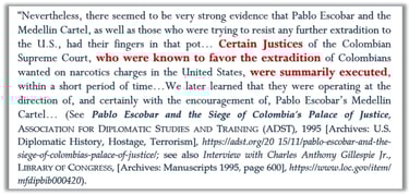 Letter from Pablo Escobar and the Medellín Drug Cartel to Justice Manuel Gaona Cruz (see full letter in MGC Death – Documentary Evidence – First Letter from the Extraditables; see also letter published in the Supreme Court's Truth Commission Final Report, id., Informe Final: Comisión de la Verdad, page 315).