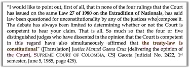 Regarding the respect for international law in Colombia and the constitutionality of the law approving the Extradition Treaty between Colombia and the United States (Law 27 of 1980), Justice Manuel Gaona Cruz wrote: