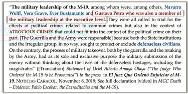 In 1990, in a letter signed and fingerprinted by Pablo Escobar, and addressed to the Commander of the National Directorate of Judicial and Investigative Police of Colombia (DIJIN), Colonel Oscar Peláez Carmona, Escobar acknowledged his relationship with the M-19 leaders, which he described as very close, stating that: "I have always been a good friend of almost all the M-19 leaders... In times of greatest tension and difficulty, I hid Álvaro Fayad and Iván Marino Ospina in my refuge" (Statement by Pablo Escobar Gaviria in 1990, see Letter from Pablo Escobar to the media and to the Commander of the Judicial and Investigative Police Directorate (DIJIN) in "Yo Protegi al M-19: Escobar" [I Protected the M-19: Escobar], EL TIEMPO, May 1, 1990, pages 1A and 1B; see also “El Jefe del Cartel de Medellin Niega Haber Ordenado Matar a Pizarro" [Medellin Cartel Chief Denies Ordering Pizarro's Killing,"LA OPINIÓN, May 1, 1990, page 8 {full letter in MGC Death – Documentary Evidence}). In an interview with Noticias Caracol, former M-19 commander and (current) Colombian president Gustavo Petro Urrego stated: "Álvaro Fayad was the one who planned the takeover of the Palace of Justice" (see Interview {video} in MGC Death - Documentary Evidence - Pablo Escobar and the M-19).