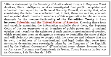Such a jurisprudential position turned Magistrate Manuel Gaona Cruz and the Magistrates of the Constitutional Chamber into military targets for Pablo Escobar and the members of the drug cartels in Colombia. This eventually led to a criminal alliance between the M-19 guerrilla—which publicly repudiated the Court's position—and the Medellin Cartel, which, despite knowing the Court's stance, filed a nullity action through an attorney against the law approving the treaty just a few days after the Court's last ruling had declared it fully constitutional. The purpose was to use threats to pressure the magistrates of the Constitutional Chamber and their families into declaring the law “unconstitutional,” through what the Medellin Cartel called: “our declaration of war” (See MGC Death - Documentary Evidence: Pablo Escobar's Second Letter to Justice Manuel Gaona Cruz).