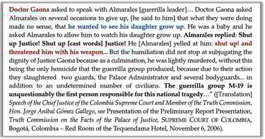 The Truth Commission established by the Supreme Court of Colombia described the human rights violations and crimes against humanity suffered by Justice Manuel Gaona Cruz at the hands of the M-19 guerrillas as "outrages against the dignity of Justice Gaona" (see Preliminary Report of the Truth Commission by Chief Justice, Hon. Jorge Anibal Gomez Gallego in Presentación del Informe Preliminar de la Comisión de la Verdad por el Magistrado y Ex Presidente de la Corte, Jorge Aníbal Gómez Gallego, CORTE SUPREMA DE JUSTICIA 2006; see video in MGC Death - Evidence).