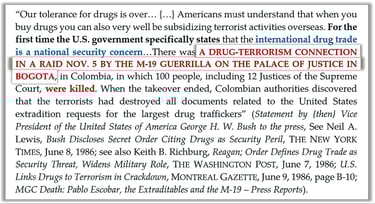 Eventually, the intermediate thesis introduced by Justice Manuel Gaona Cruz and supported by his colleagues in the Constitutional Chamber of the Supreme Court of Justice became the greatest risk for Pablo Escobar, The Extraditables, the Medellín Drug Cartel, and drug trafficking routes from Colombia to the United States of America; official estimates indicate that the drug trafficking business in Colombia generated more money than the Colombian State itself, and Justice Manuel Gaona Cruz, author of the thesis that prevented the declaration of unconstitutionality of the law approving the treaty between Colombia and the United States, which he defended along with his colleagues in the Constitutional Chamber (Carlos Medellín Forero, Alfonso Patiño Rosselli, Ricardo Medina Moyano) before the Plenary Chamber of the Court on the four occasions when its annulment was demanded before the Supreme Court of Justice (between 1982 and 1985), became the greatest risk for Pablo Escobar, The Extraditables, and the drug trafficking business, which controlled 80% of the cocaine entering the United States of America in November 1985 (See Report of the U.S. Drug Enforcement Administration DEA in The Rise of the Medellin Drug Cartel: 1980–1985, U.S. DRUG ENFORCEMENT ADMINISTRATION (DEA) [DEA History: Archives & Reports], https://www.dea.gov/sites/default/files/2021-04/1980-1985_p_49-58.pdf); consequently, the Justices of the Constitutional Chamber were the primary target of The Extraditables and the Medellín Cartel on the day of the Palace of Justice takeover, as the fate and future of the business of the world's richest and most powerful criminal organization was being decided in November 1985 (Id.; see also Declaration of U.S. Ambassador to Colombia Charles Anthony Gillespie Jr. about Pablo Escobar and the Palace of Justice takeover in Pablo Escobar and the Siege of Colombia's Palace of Justice, ASSOCIATION FOR DIPLOMATIC STUDIES AND TRAINING (ADST) 1995 [Archive: U.S. Diplomatic History, Kidnapping, Terrorism], {excerpts} Library of Congress, Interview with Ambassador Charles Anthony Jr., LIBRARY OF CONGRESS, page 600, https://www.loc.gov/item/mfdipbib000420).