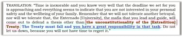 Following multiple bomb threats to his residence, surveillance of his family, phone calls, and audio cassettes with intercepted conversations of his children, on Sunday, September 1, 1985 and, while having breakfast with his wife and children, Justice Manuel Gaona Cruz received a second letter from Pablo Escobar signed by the group "los Extraditables" [The Extraditables]. In the letter, the Extraditables warned him not to defend his thesis on the constitutionality (the intermediate thesis) of the law approving the Extradition Treaty (see Pablo Escobar's and the Medellín Cartel's Second Letter to Justice Manuel Gaona Cruz in MGC Death – Documentary Evidence: Threats to Justice Manuel Gaona Cruz; see also the letter in Informe Final: Comisión de la Verdad Sobre los Hechos del Palacio de Justicia, CORTE SUPREMA DE JUSTICIA DE COLOMBIA, Ed. Universidad del Rosario 2010, page 315).